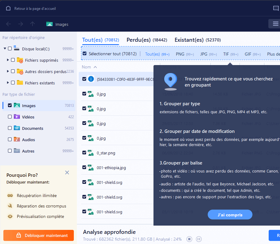 Durant les premières minutes de mes recherches, je suis allé un peu vite en besogne et du coup je me suis fait prendre comme un bleu, du coup petite précision sur le logiciel. Dans la capture ci-dessous, il vous propose de faire une recherche par type de fichier avec des grandes familles (images, vidéos, etc.). Alors attention, car ce qui n'est pas précisé par le logiciel c'est qu'il a mélangé fichier toujours présent sur le disque et ceux effacés !